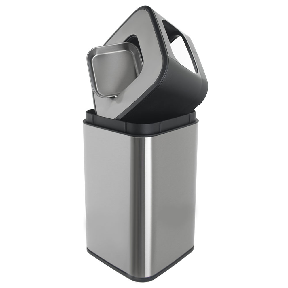 Стальной корпус сочетает в себе долговечность и современный стиль. Благодаря разнообразию объёмов сенсорные вёдра используют не только дома: на кухне, в санузле, в детской комнате; но и в офисах или обеденных зонах компаний, а также в загородных домах и коттеджах. Надежное ведро-вставка и фиксатор мешка делает использование мусорного ведра удобным на протяжении всего срока эксплуатации. Особенностью данной модели является разнообразие в открытие верхней крышки, которыми возможно воспользоваться в зависимости от ситуации.