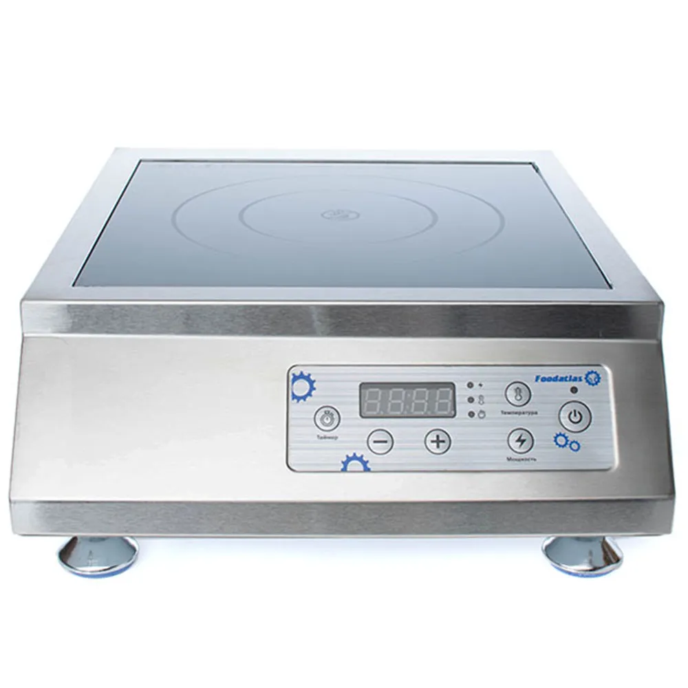 Плита индукционная настольная Foodatlas FA-3500 – еще один качественный, надежный товар собственного производства компании Foodatlas. Используется для приготовления горячей пищи в специальной посуде с высоким содержанием железа и имеющей толщину дна не менее 5 мм. Благодаря применяемому принципу электромагнитной индукции высокая температура достигается путем разогрева не самой плиты, а именно посуды. Отсутствие классических нагревательных элементов позволяет не допускать неэффективного использования электроэнергии и не «греть воздух».